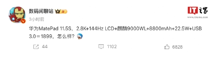 博主 @數碼閑聊站 今日發布微博“華為 MatePad 11.5S,2.8K+144Hz LCD + 麒麟 9000WL+8800mAh+22.5W+USB 3.0=1899”。