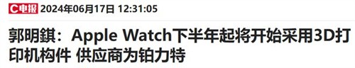郭明錤還提到,蘋果手表將從今年下半年開始采用由3D打印技術生產的部件。這項計劃原定于去年開始量產,而在經過了1年多的密集測試后,3D打印技術的生產效率已有明顯改善。