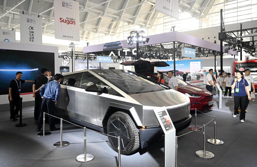6月20日,參觀者在博覽會智能網聯汽車展區參觀特斯拉皮卡車。新華社記者 趙子碩 攝