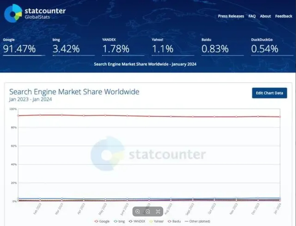面對搜索這塊肥肉,國內外大廠和創業者都虎視眈眈,OpenAI的野心也已彰顯。但是長期以來谷歌占據著全球搜索引擎領域的霸主地位,市場占有率居90%以上,OpenAI能在谷歌那里分到一杯羹嗎?